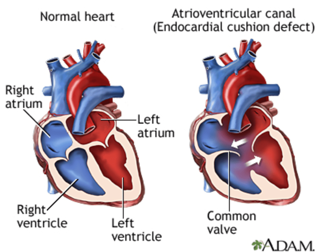 This very week, Zeke had his surgery to fix his heart defect. I’m a little rusty on the numbers, but I believe way back earlier this year when we were introduced to this world, that about 40-60% of babies born with Down Syndrome (DS) — officially called Trisomy 21 — will likely have some kind of heart issue or defect. We were very fortunate and blessed to learn that although he did have a heart defect, that his was in the “lesser of two evils” category, so to speak. I won’t go into egregious detail as you can Google AV canal defect and find many medical journals and peer-reviewed articles on the subject matter, but suffice to say this image is a rudimentary overview: